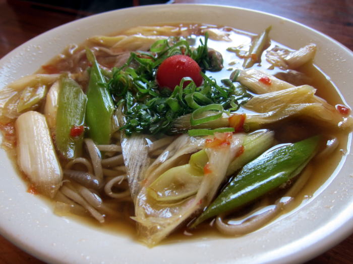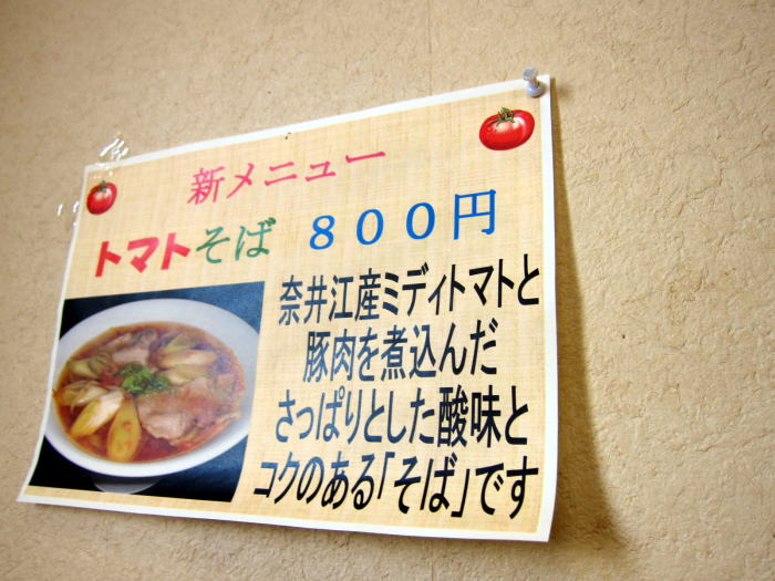 たのんだのは壁の新メニューという表示をみてトマトそば800円です。からまつ園といえば風味のいい牡丹蕎麦のおいしさを味わえるせいろもいいかと思いましたが、トマトとそばの取り合わせに興味を持ちました。