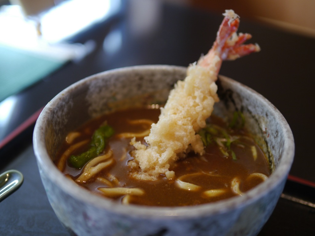 牛ほほスープ辛口スパイシーカレーうどんエビ天1本入り 1100円 スープは4種類ありました。すっかり外の寒さで冷えたためか、身体が欲しがったのは辛口のスパイシーカレー、牛ほほ肉も入った濃厚なスープと和風だしのおいしいスープとても身体が温まりました。