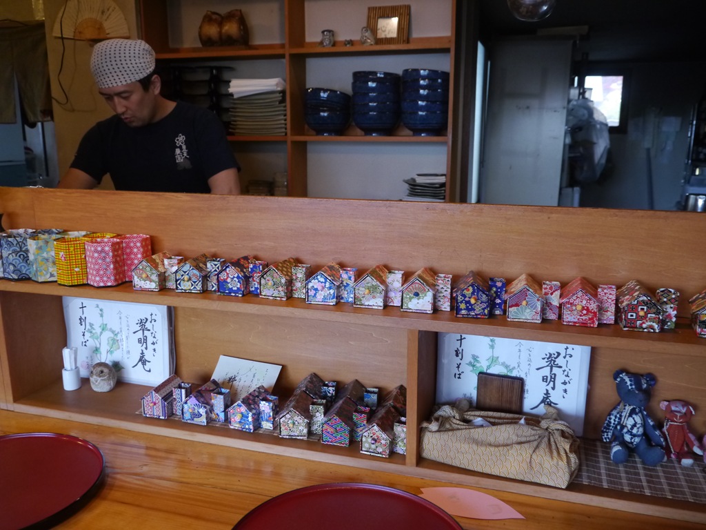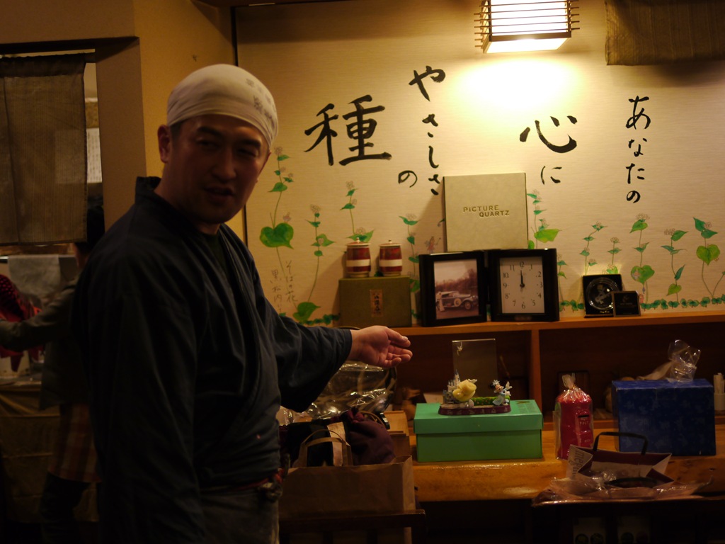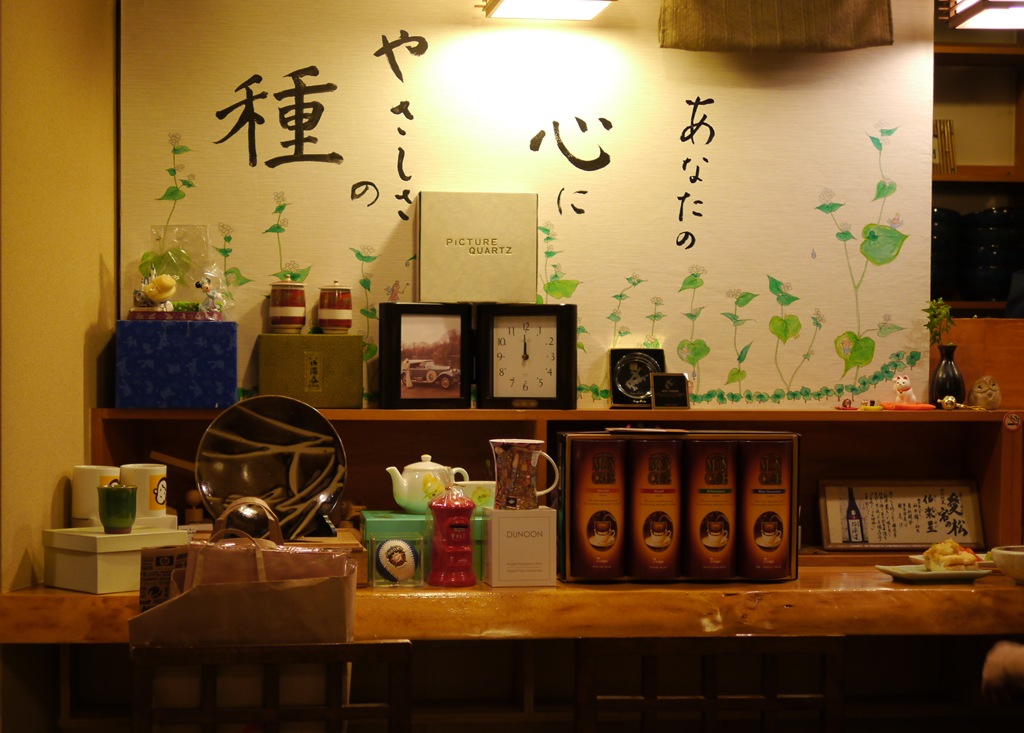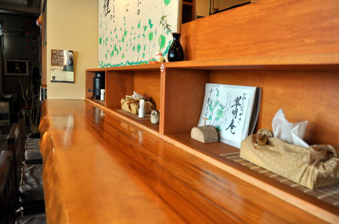 次の日のお昼、おいしいお蕎麦を食べにまたまた、翠明庵へ昨日、伯楽星とあたごの松が並んでいたカウンタはきれいに磨かれていました。店主さんも朝起きるのがさすがにつらかったということです。