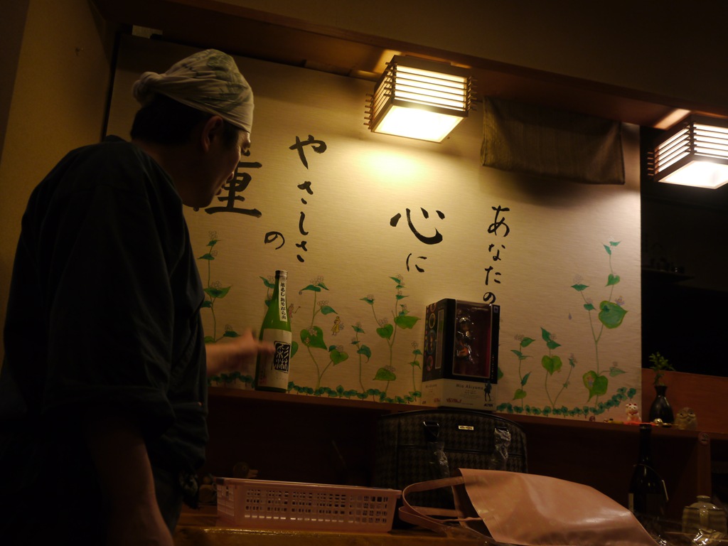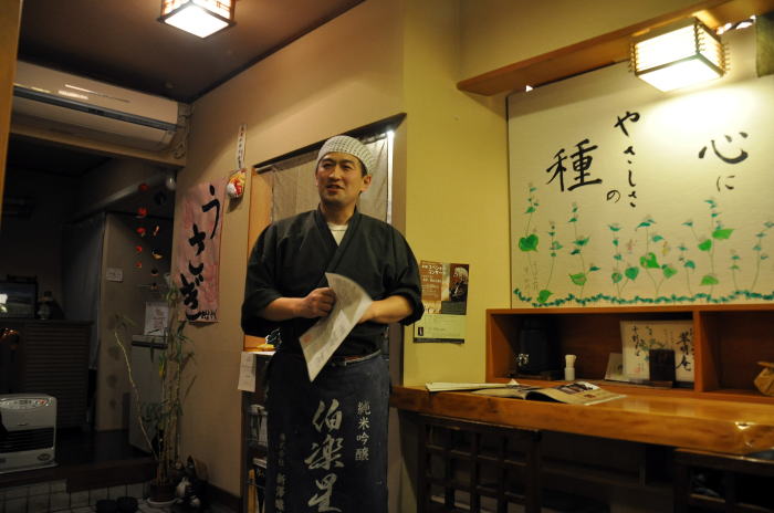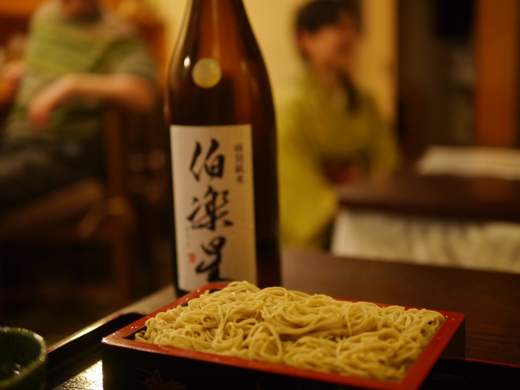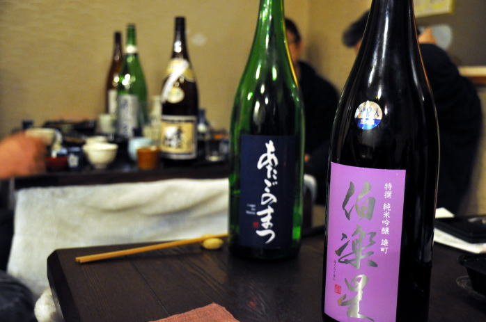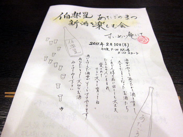 おいしいお蕎麦とお酒を味わえる、西野の翠明庵で2011年2月10日に開かれた、伯楽星あたごのまつ新酒を楽しむ会に参加してきました。伯楽星やあたごのまつを作っている新澤醸造店の杜氏新澤巌夫さんはアメリカのグラミー賞レセプションに行っているということでこの日は翠明庵店主の吉田強さんが司会進行解説をすべてこなしながらの会です。
