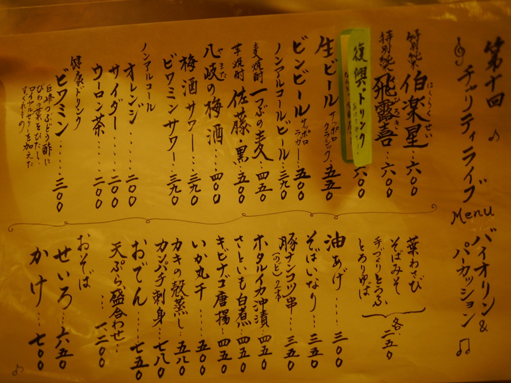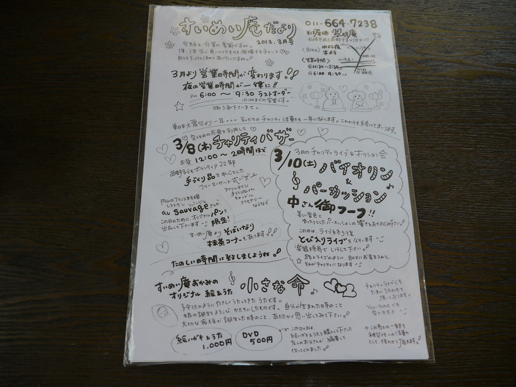 第9回の翠明庵のチャリティライブの案内です。今回2011年9月の第5回チャリティできれいな音色を響かせてくれた狩原枝里子さんが登場します。また、すてきな演奏が聞けると思うととても楽しみ、素晴らしい演奏とともに、翠明庵のお蕎麦、日本酒の伯楽星の豪華な時間を過ごすことができます。