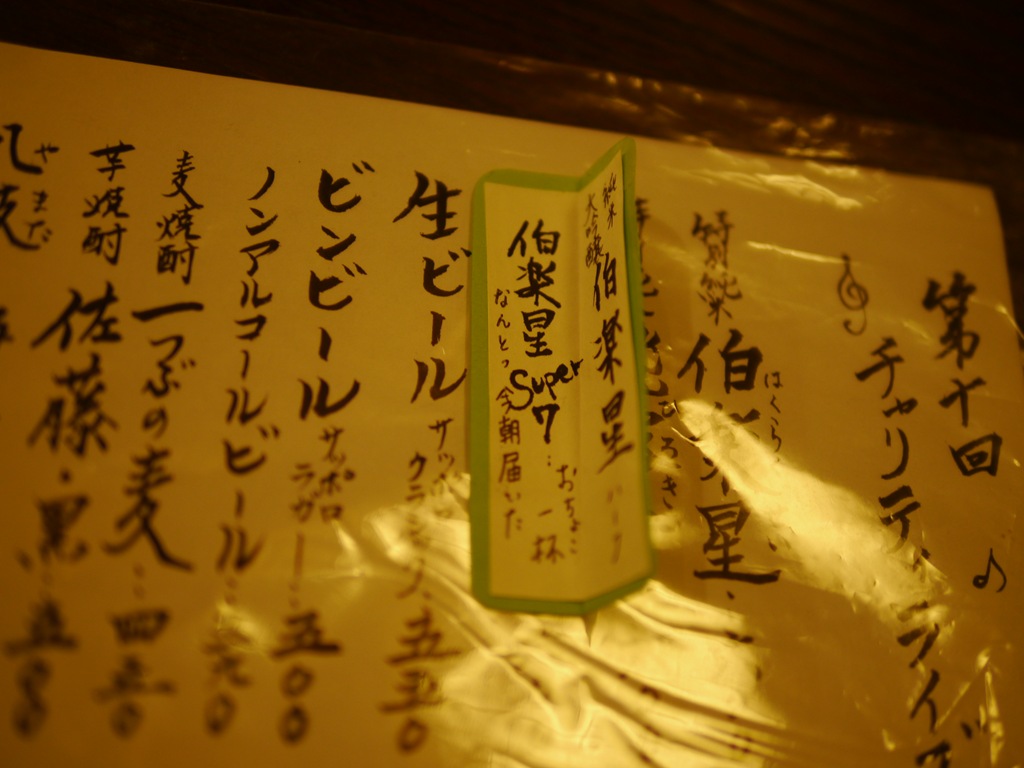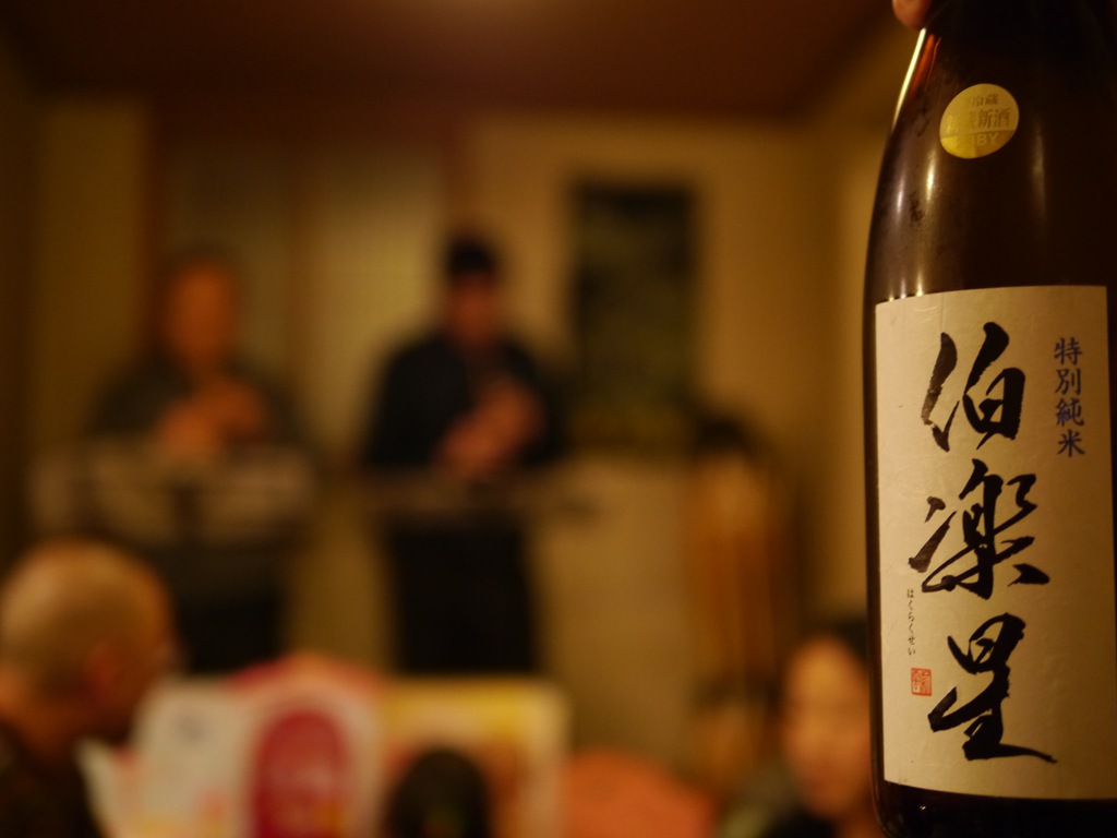 伯楽星特別純米はこの日のおいしいお酒の中でも、納得のおいしいお酒です。お店定番のお酒にはそのお店に合う不思議な安心感を感じました。店主の楽しい解説を聞きながらみなさん楽しくお酒がすすみました。飲み過ぎてお楽しみの蔵出し秘蔵酒を飲む前にかなり酔いがまわってきてしまいました。酔いながらも店主のお話の中で伯楽星の由来が印象に残りました。三本木町で昔、馬の目利きのことを伯楽と呼び、名人の伯楽が見いだした馬が一日に千里を駆けて星になったという古事からきているというようなお話でした。