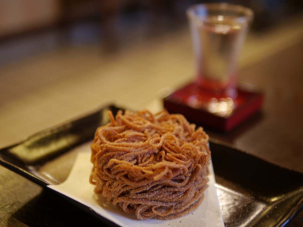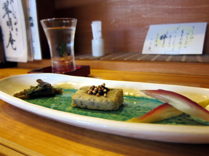 伯楽星を楽しみながら、お料理も楽しめました。お餅のようなもちもちした食感で何だろうと思った肴は聞くと、お餅ではなく生湯葉から作ったということで、上にのっている蕎麦味噌も伯楽星によくあいます。