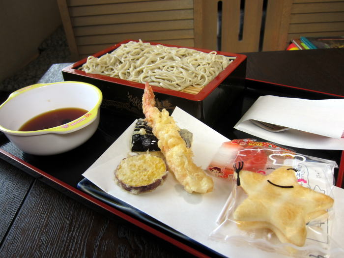 お子様セット500円 10割そばのせいろに天ぷらはエビ天もついています。かわいいおかしまでついた本格蕎麦は子供の食育にも良さそうです。