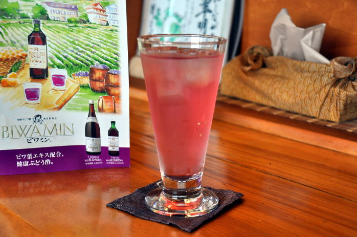 たぬしまる巨峰で作ったぶどう酢にびわの葉をひたし、ロイヤルゼリーを加えた身体にいい飲み物で、アルコールを分解してくれるようです。飲んですっきりしました。新澤醸造店のお酒を扱っている宮城県の齋林本店で扱っているそうです。