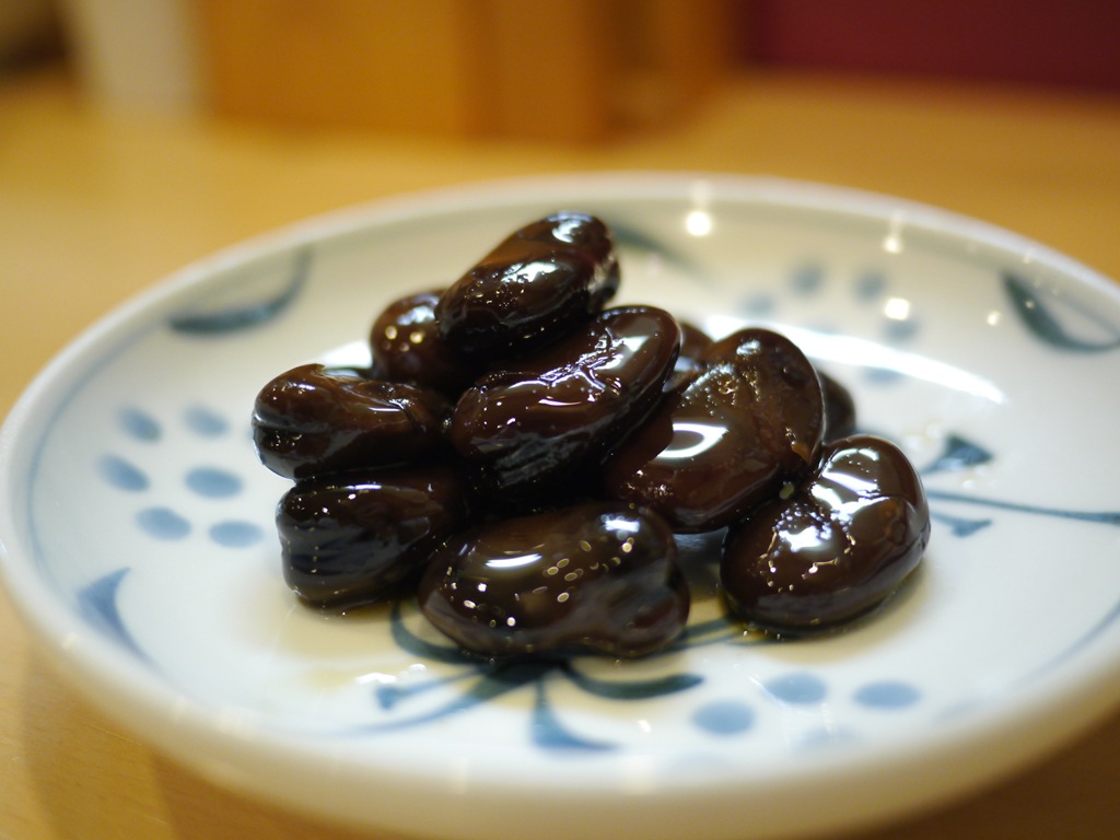 正油豆 300円 いつもはお昼ごはんで訪ねていましたが、いつもおすすめ黒板の肴が気になってこの日やっといただくことができました。しっかりと味のついた大きな空豆、日本酒にぴったり。