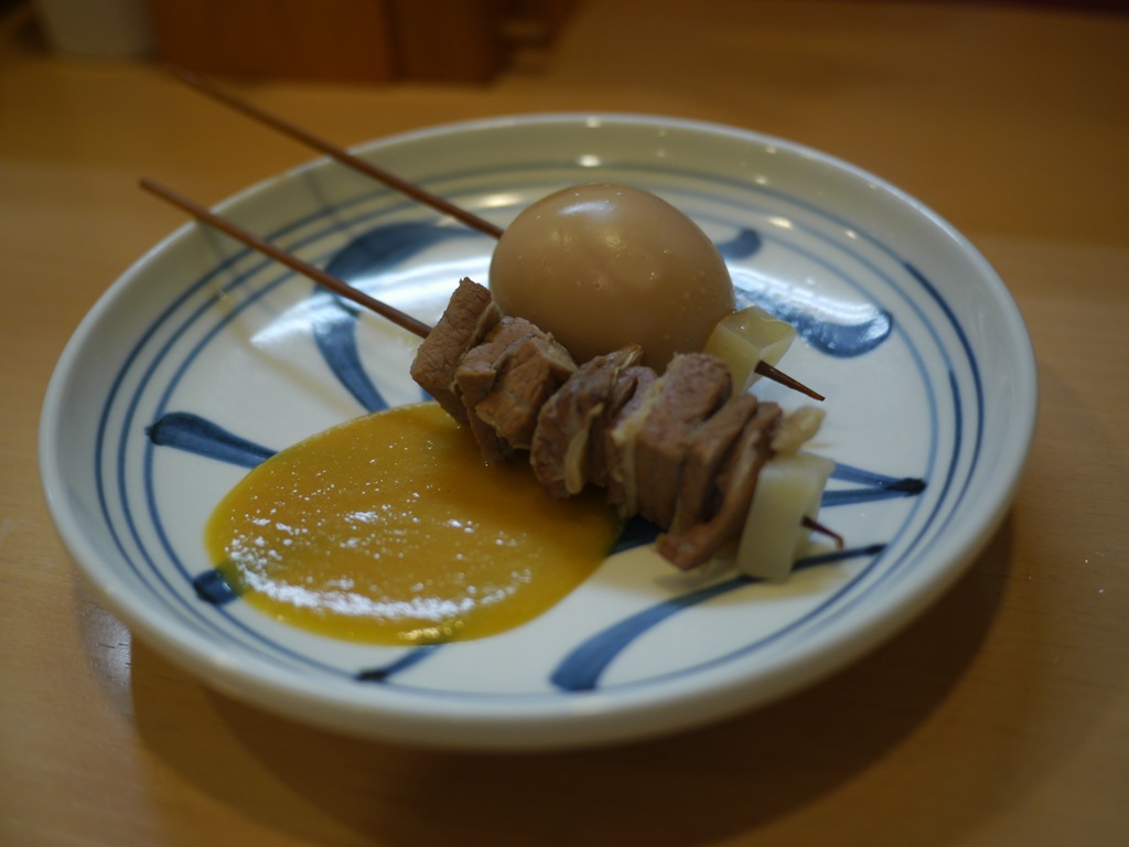 牛すじ 180円、玉子120円 からしみそでいただく、おいしいおでん、道産の牛すじおいしい。燗酒にもぴったり