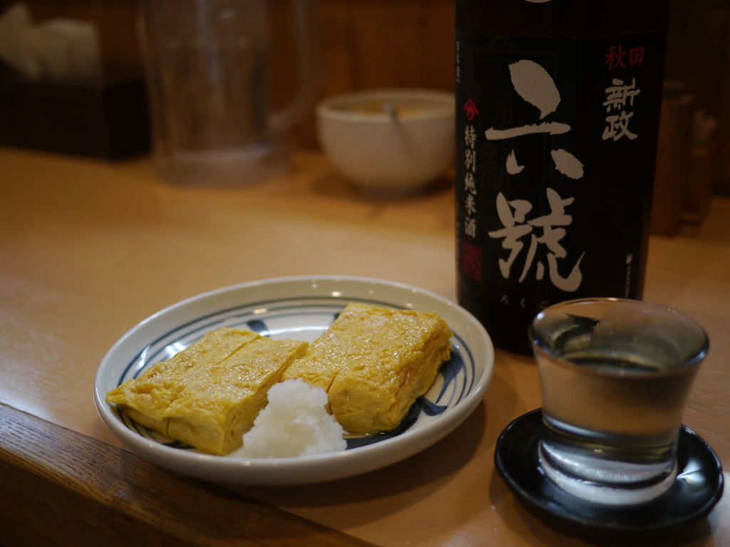 玉子焼 550円、新政純米 400円 ふわふわのおいしいだしのアツアツ玉子焼きに冷たいお酒