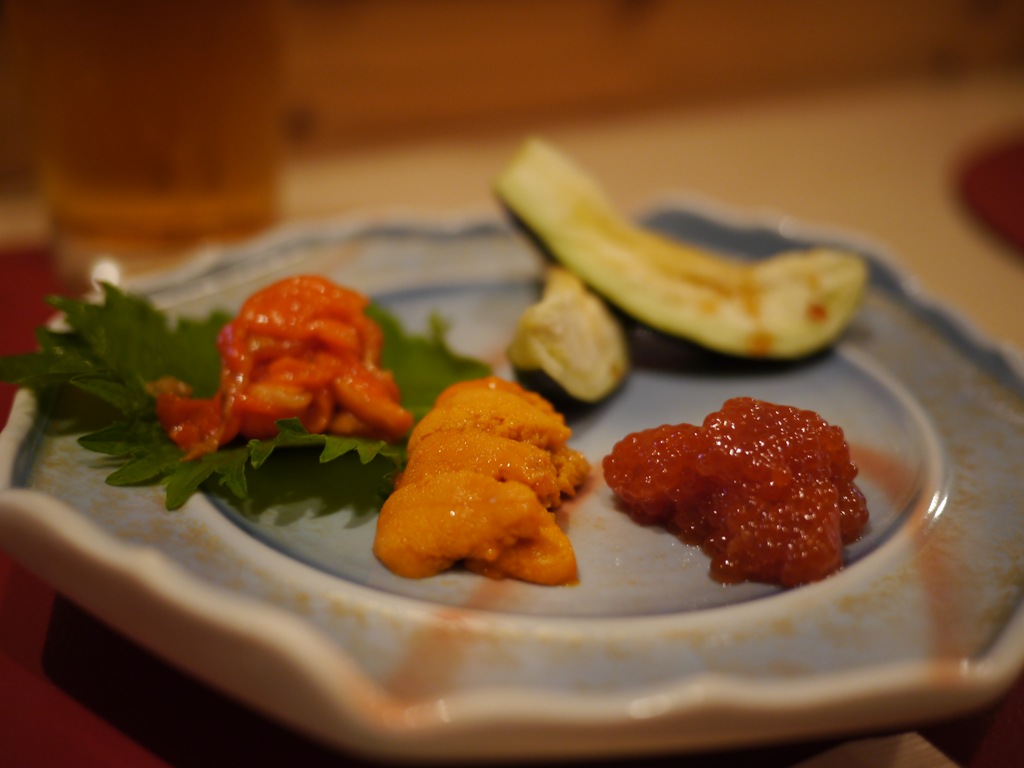 造ってもらった肴は、初夏の幸が4品、おいしさたっぷりのほや、甘みの強い小樽の雲丹、優しい塩加減がお酒によくあう時鮭の子、泉州の水茄子の漬け物どれもおいしく、初夏を楽しませてもらいました。
