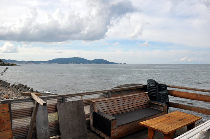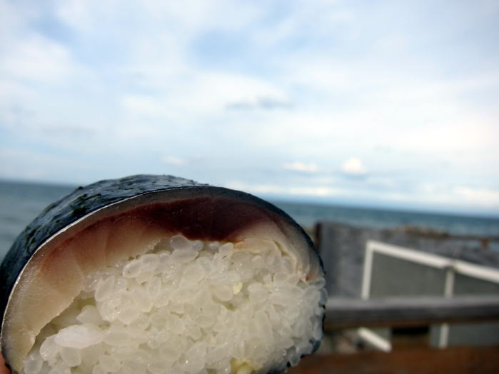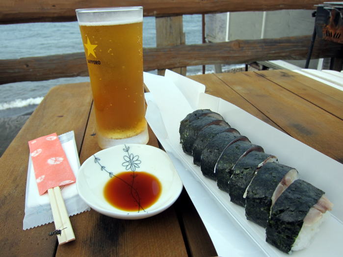 どの棒寿司にするか迷いましたが、鯖の棒寿司とビールをお願いして、テラスへ、テラスにはテーブルがいくつかありましたが、珍しい木のソファーに落ち着きました。目の前は海が広がる何とも心和む場所です。遠く祝津岬が見えていました。