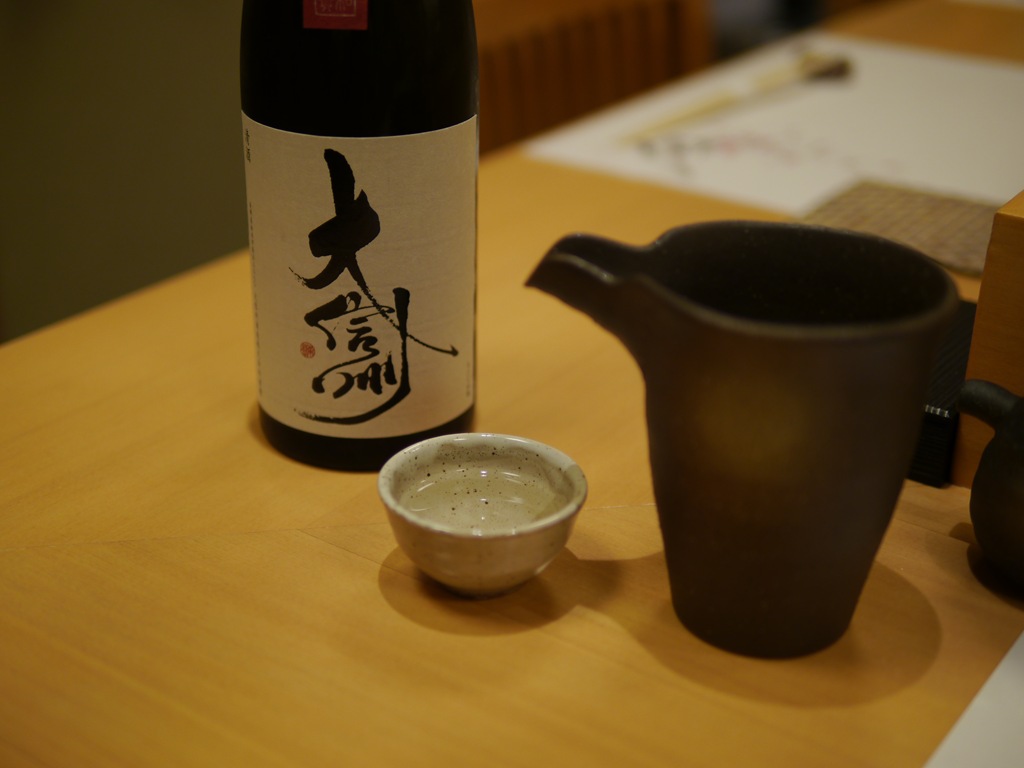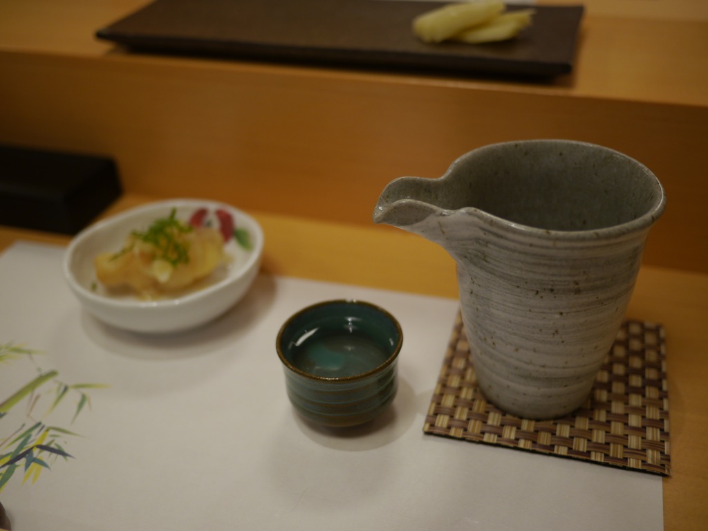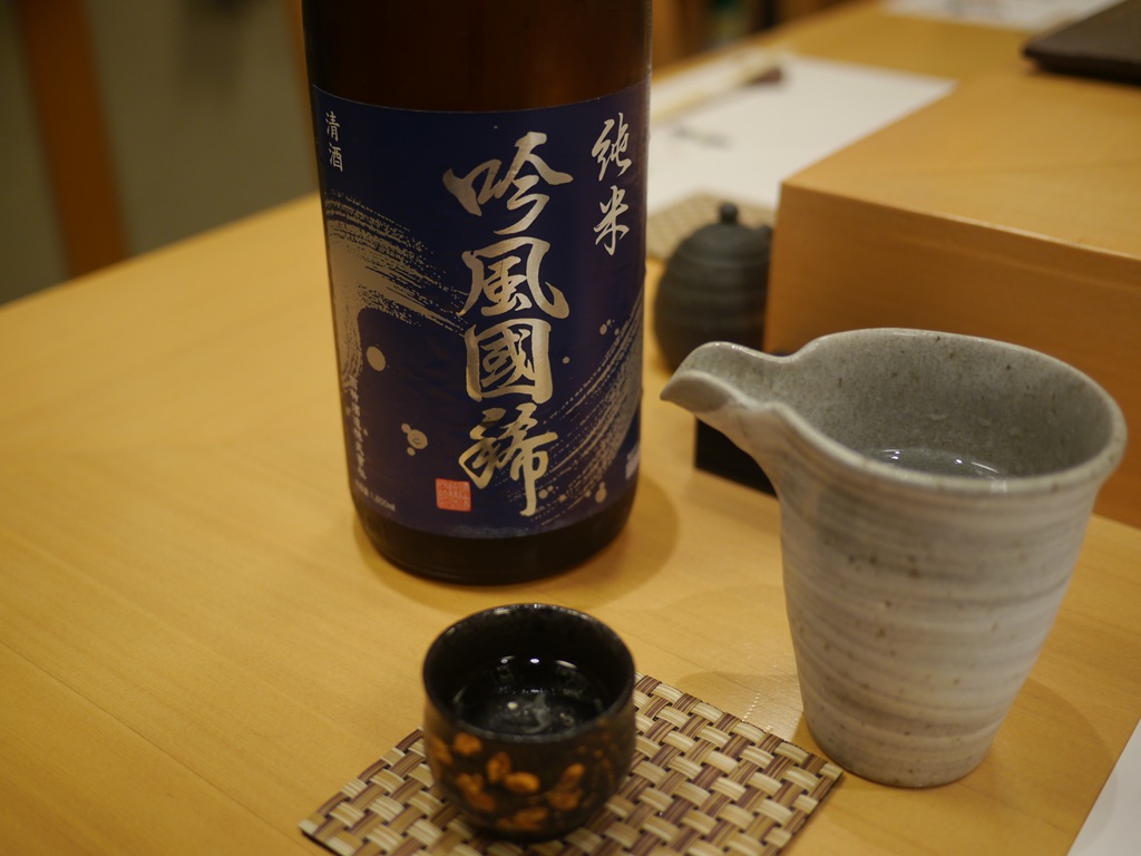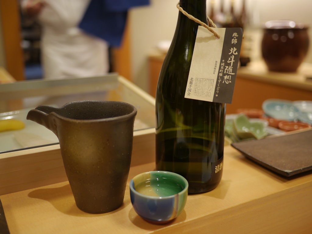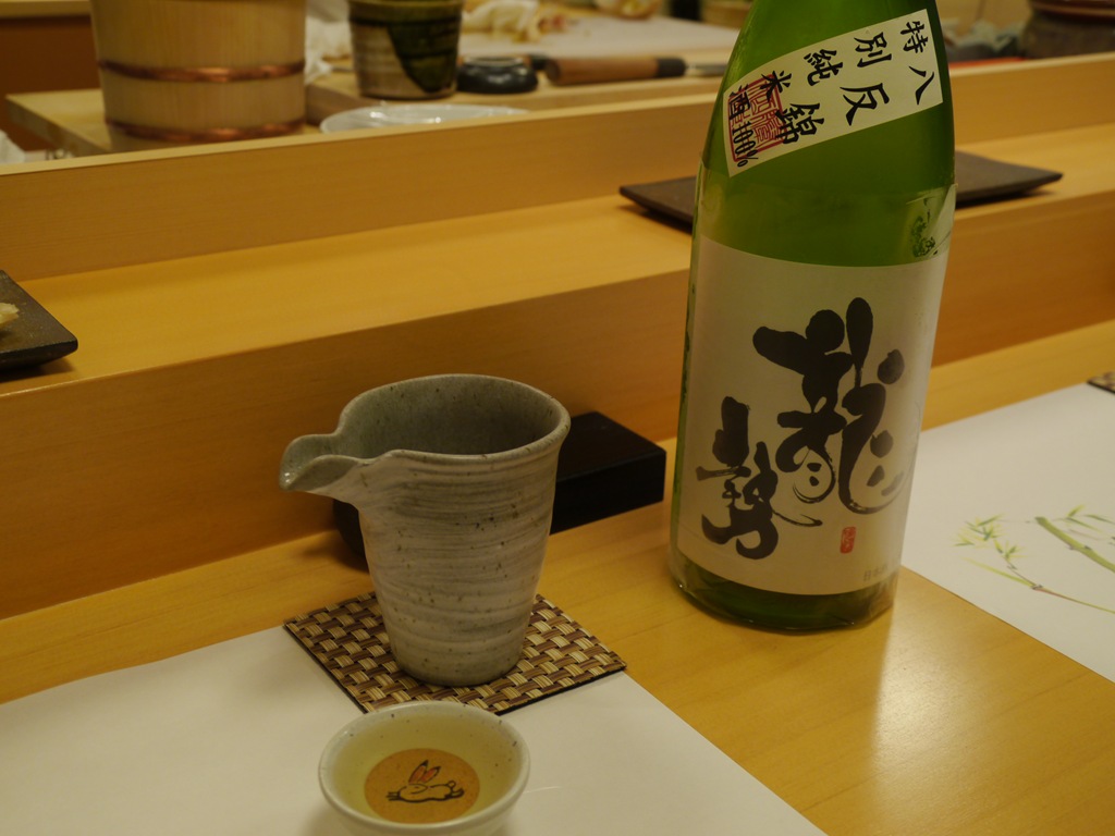 おいしい鰺のたたきに、日本酒が飲みたくなり、いただいのは龍勢八反錦特別純米酒、うまみときれのあるおいしい日本酒で鰺のたたきにもぴったり。鮨さいとうの日本酒、料理に合うおいしい日本酒ばかりで、安心していただけます。