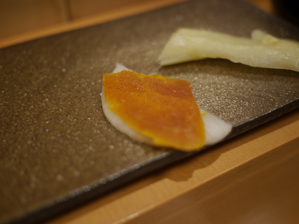 自家製からすみの炙り そのままでも素晴らしいからすみを炙っていただくとさらに香ばしく素晴らしい味,お正月に食べたい味です。