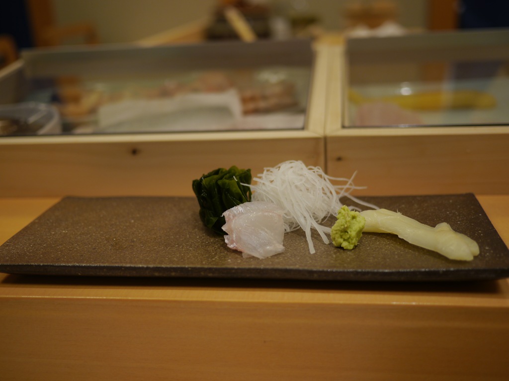 おいしいからすみをいただいて、次に平目のお刺身をいただきました。日本海の平目身がしまっていて、食感よくおいしい。
