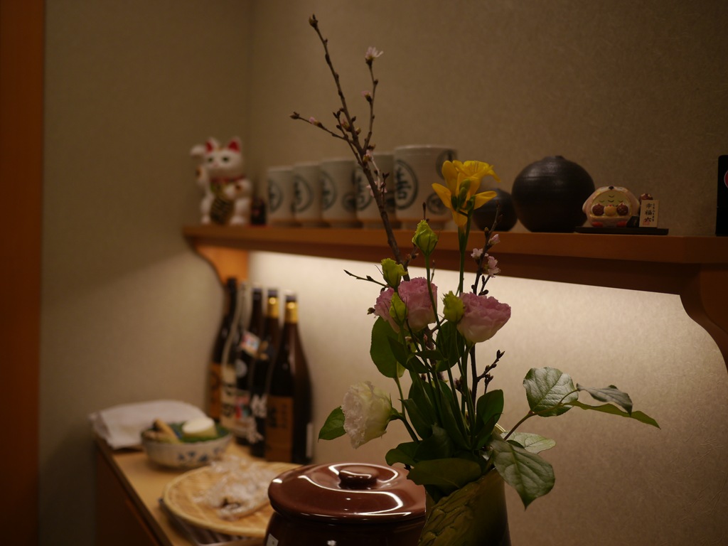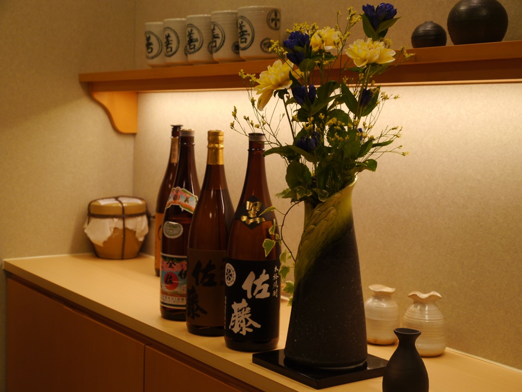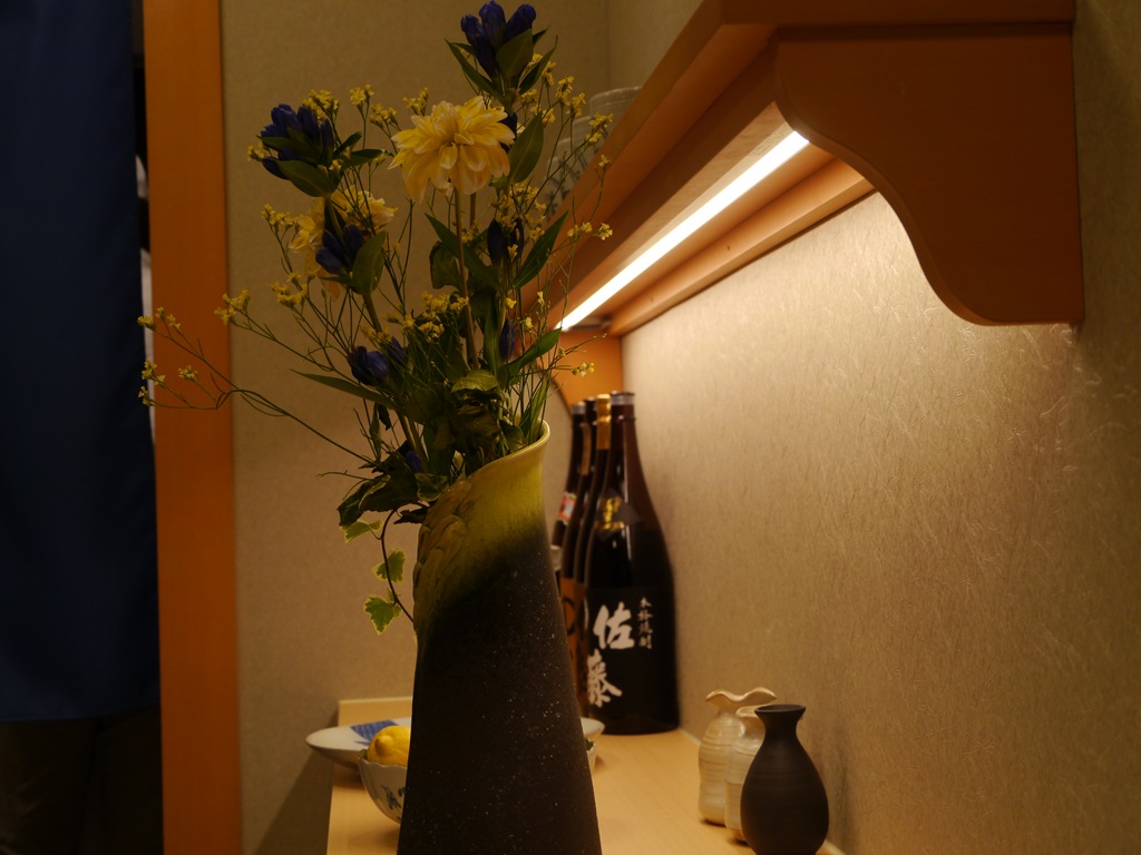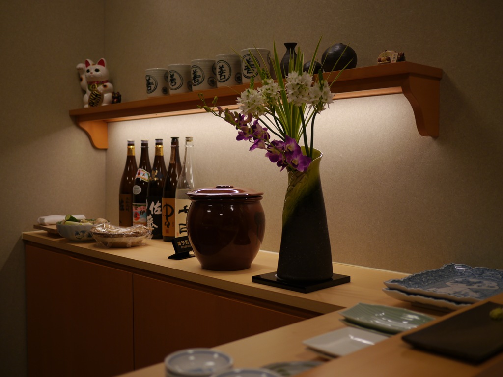 カウンタの奥の棚にはきれいなお花とともに、おいしそうな焼酎が並んでいます。さらに上にはすし善の湯飲みが並んでいました。