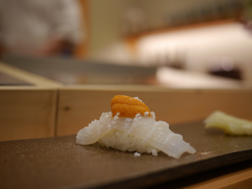 芸術作品のような美しい包丁が入ったイカの握りにはきれいな雲丹、雪塩でいただきます。