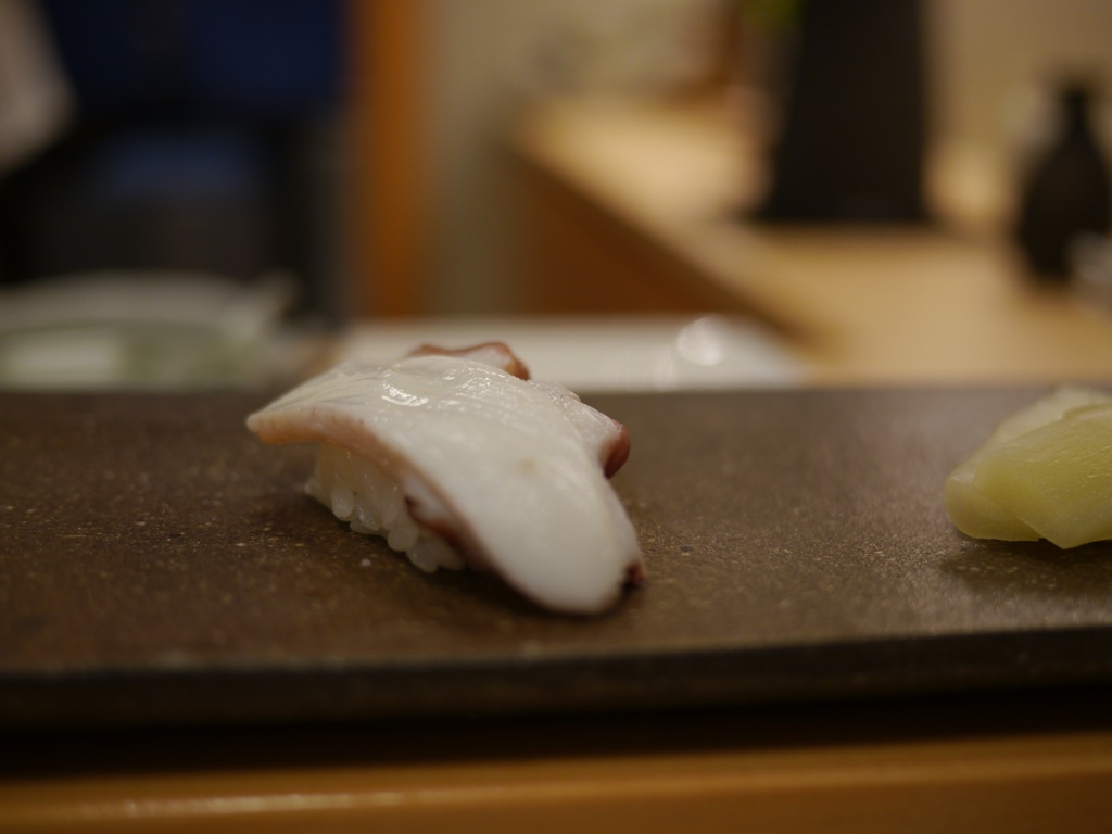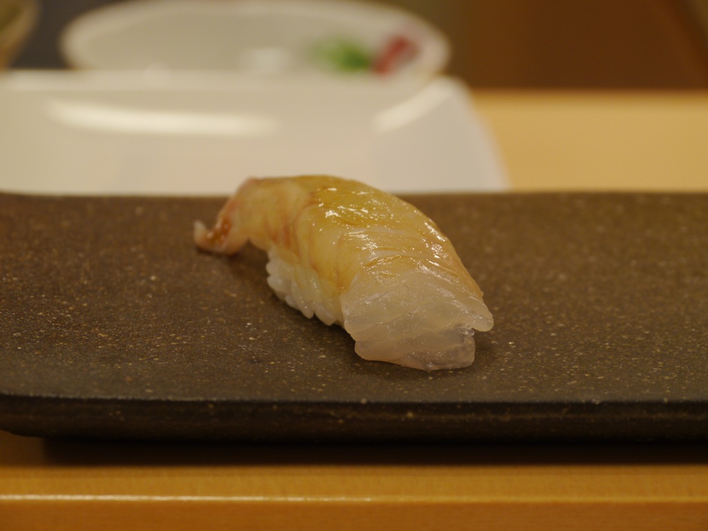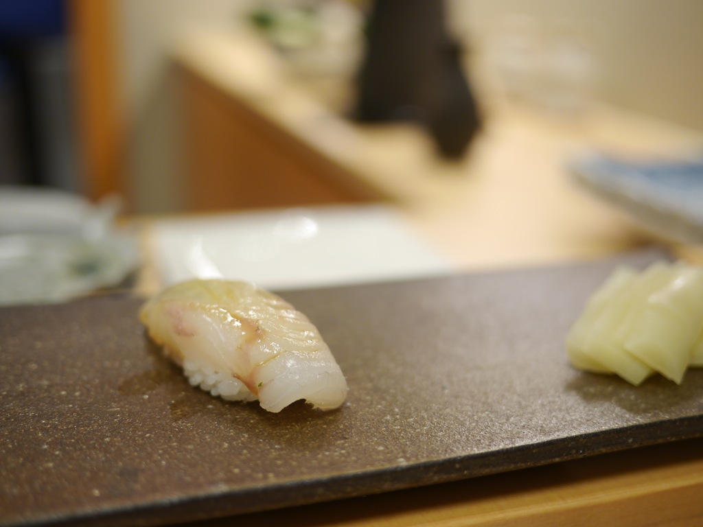 すし善で握っていた店主さんに申し訳ないですが、安い設定を伝えて一人前握ってもらいました。最初はひらめ、そのまま口に入れるとごはんがぱらぱらとほどけ、ひらめのしっかりとした身はうまさたっぷり。