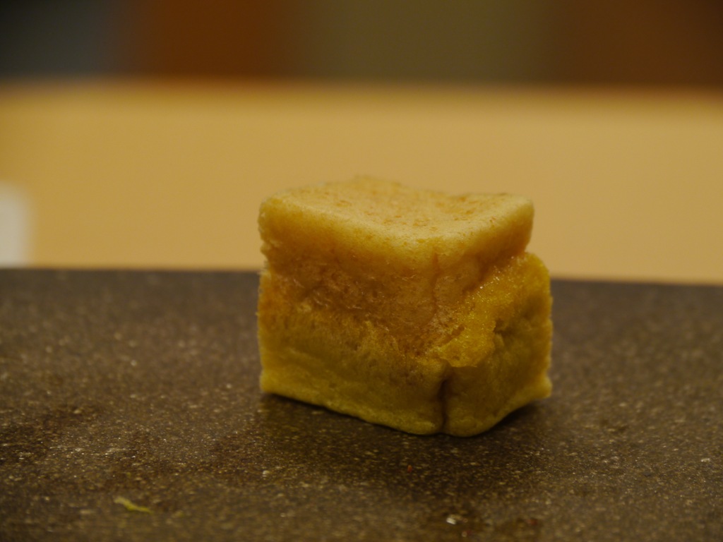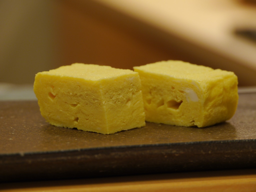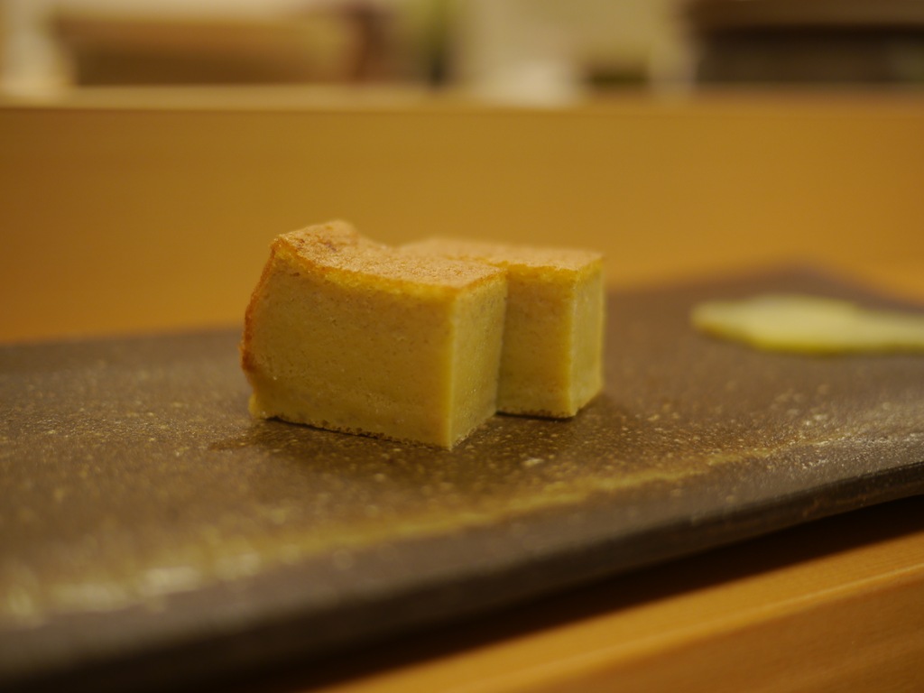 握りの〆に卵焼き おいしくきれいな卵をいただいてとてもしあわせな気分になります。