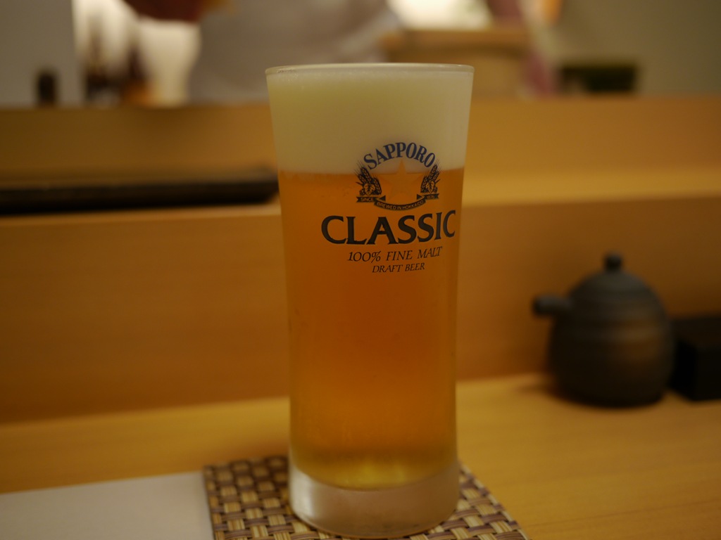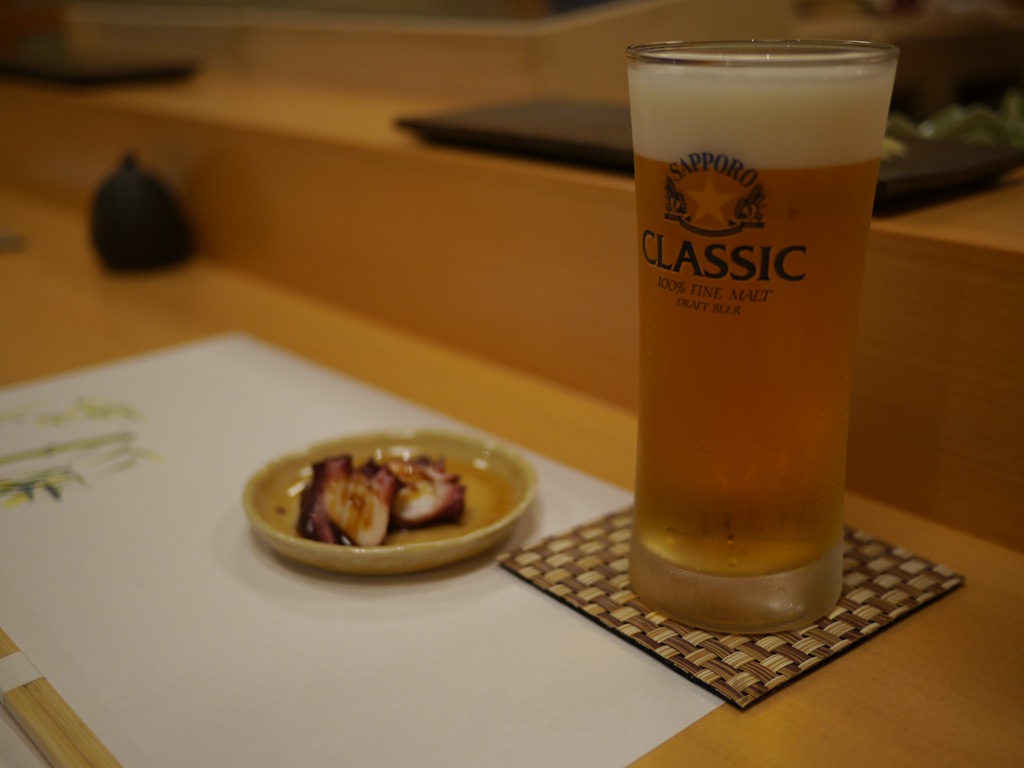 暑い日が続いて、夕食前に軽くビールをいただきにJR琴似駅そばの鮨さいとうへ、6席ほどのカウンタ今日は向かって左側に座りました。早い時間の訪問でしたが、すでに一組楽しそうに食べているお客さんがいます。