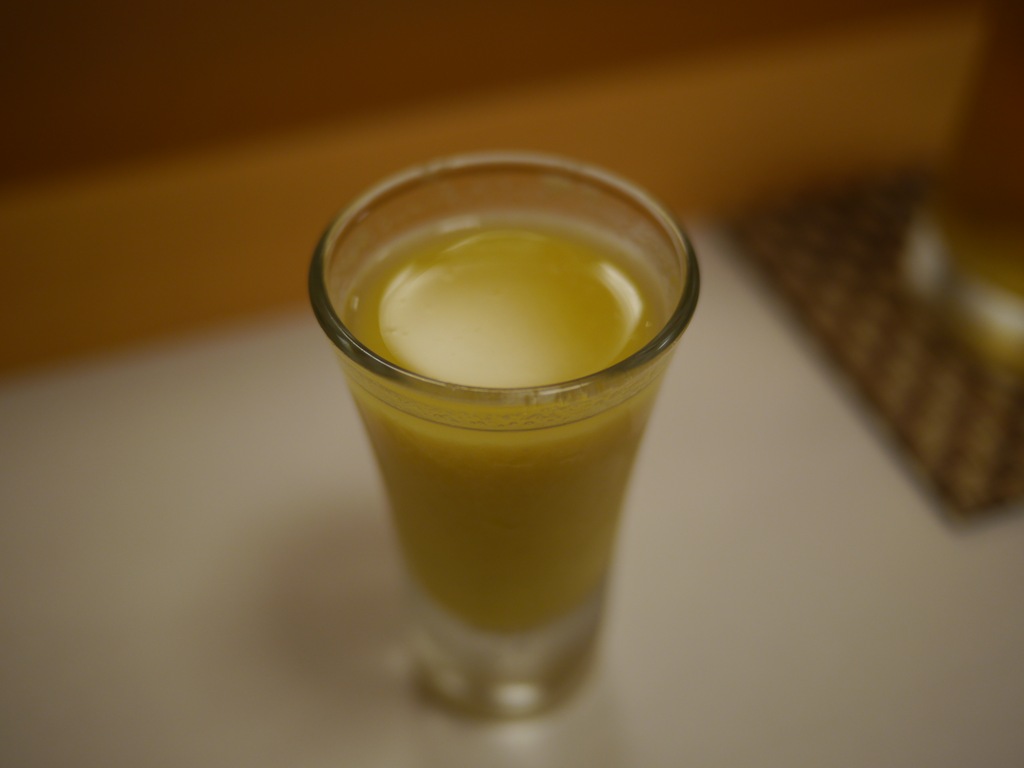 おいしいビールを飲んでいて、最初に出てきたのは、この時期、とてもおいしいとうきびの冷製スープです。甘みとうまみが一度に味わえます。