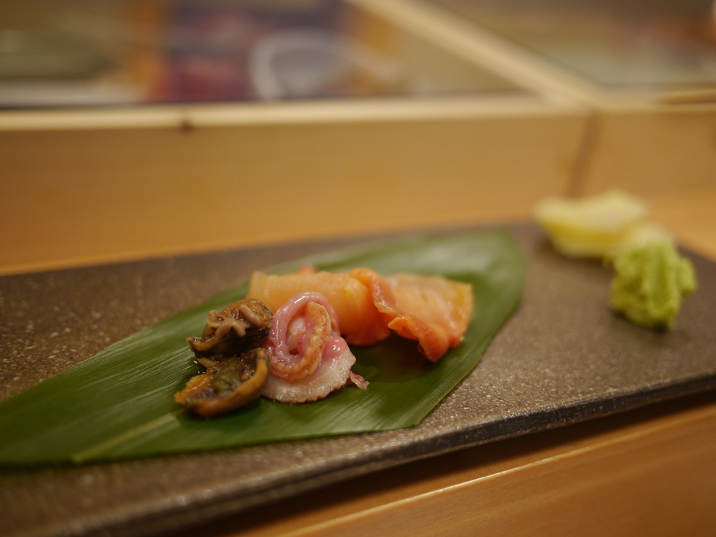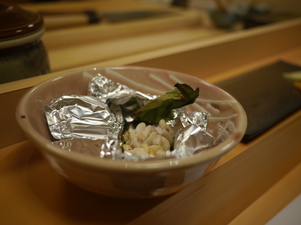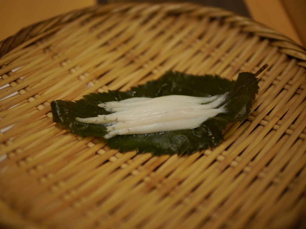 ここで、すごいものを目にしました。古典的な江戸前のお仕事、桜の葉で白魚を蒸したという、初めて見るスシネタです。琴似で古典的な江戸前の鮨を味わえるうれしさ。