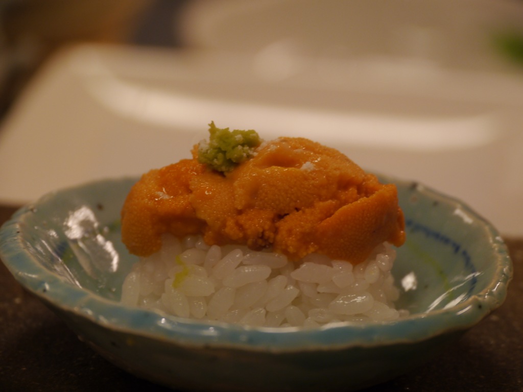 何とも夏らしい、きれいなオレンジ色が食欲をそそります。わさびと粗塩がのっていてそのまま口に運ぶと、海のおいしさが広がります。