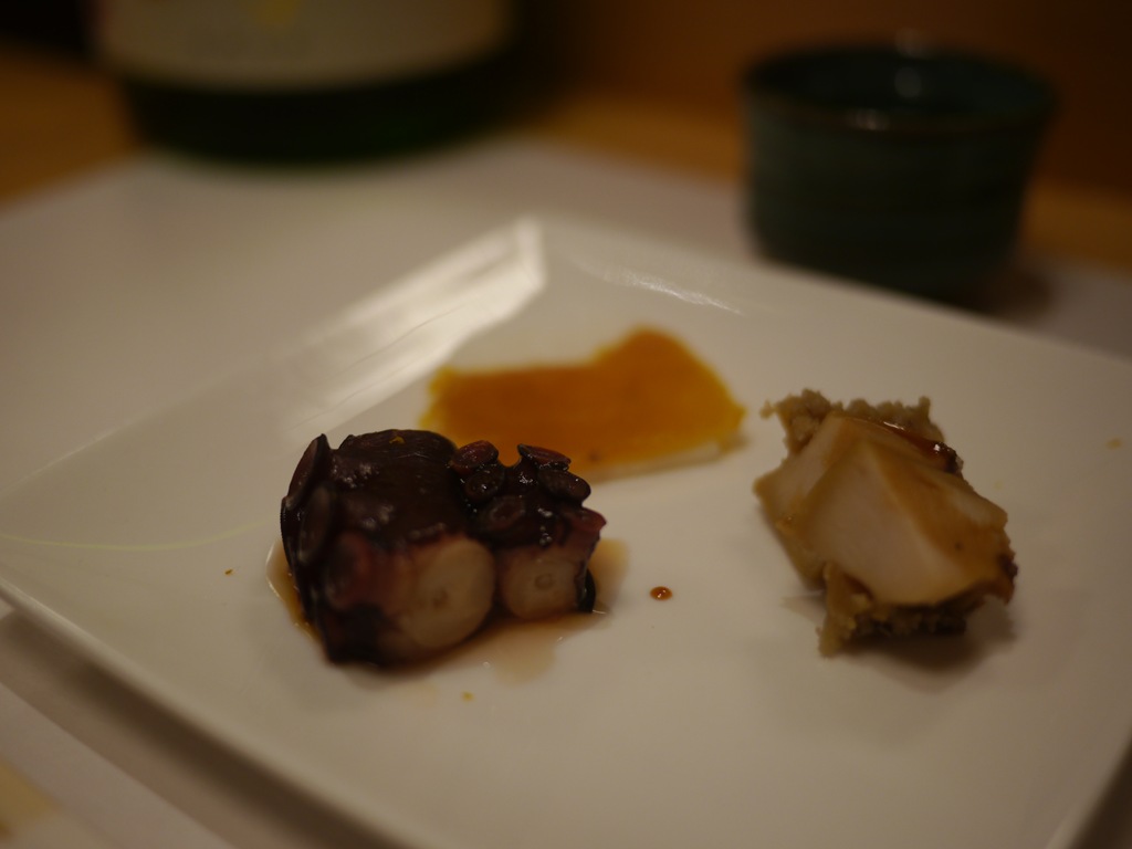 日本酒に合わせて、おすすめをいただきます。一皿目から豪華な取り合わせ、口に含むとうれしくなるたこの柔らか煮、大根にのった自家製からすみ、日本酒がすすむ味付けの煮アワビどれもおいしく加賀鳶にもぴったり。