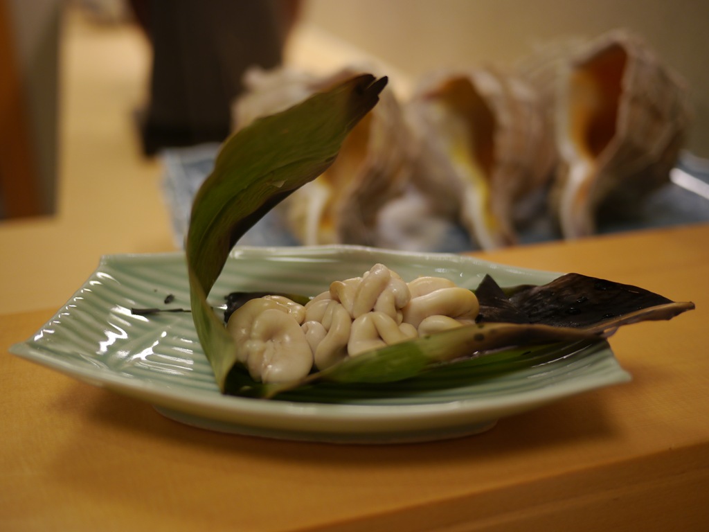 笹の葉にのって目の前に、とてもきれいな赤貝のお造りがでてきました。身とひもときもとそれぞれ食べやすくきれいに盛られています。おろしたてのわさびを少しつけて醤油でいただきました。とても美味しく、ついつい、すっきり飲める国稀がすすみすぎてしまいます。家に帰る前に長居してしまいそうなので、この日はすぐ会計をしてもらいました。