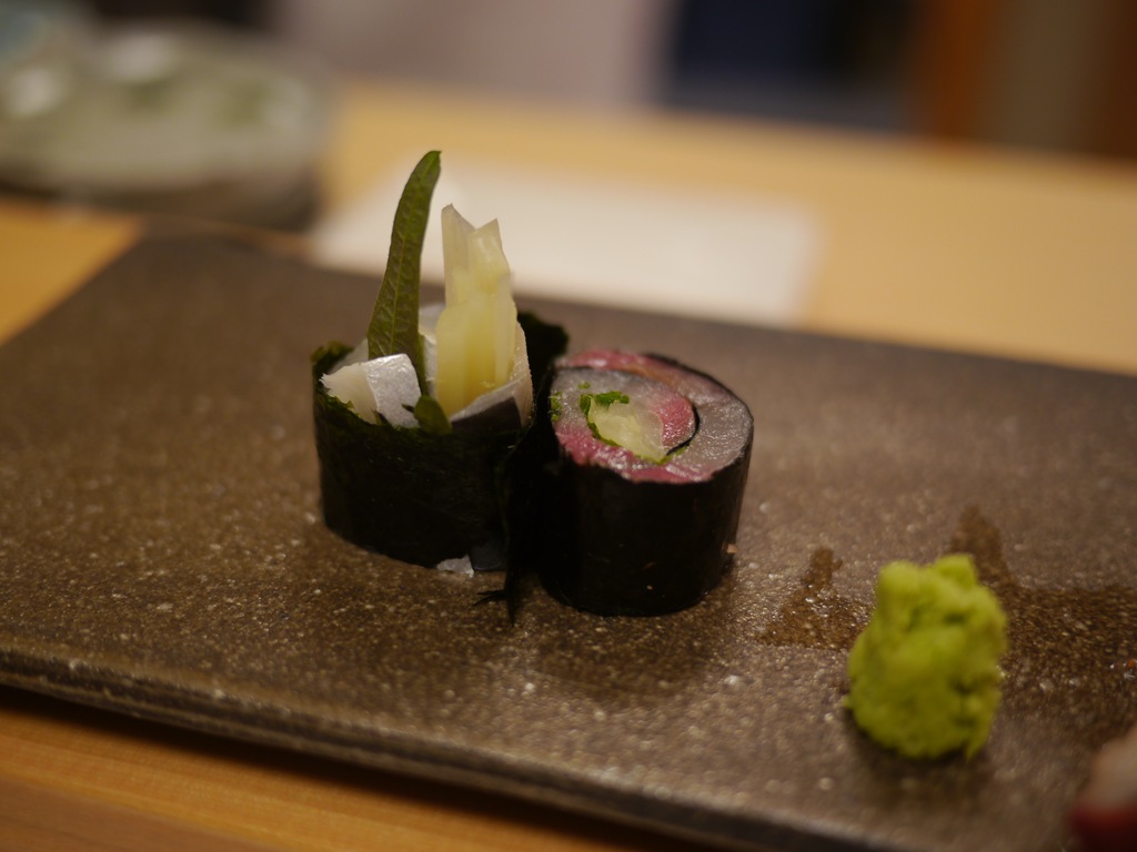 強めにしめたさばと、がりと大葉 のりに巻かれた美しい肴に、食べるのがもったいなくなりますが、口に入れるとうれしいおいしさ。