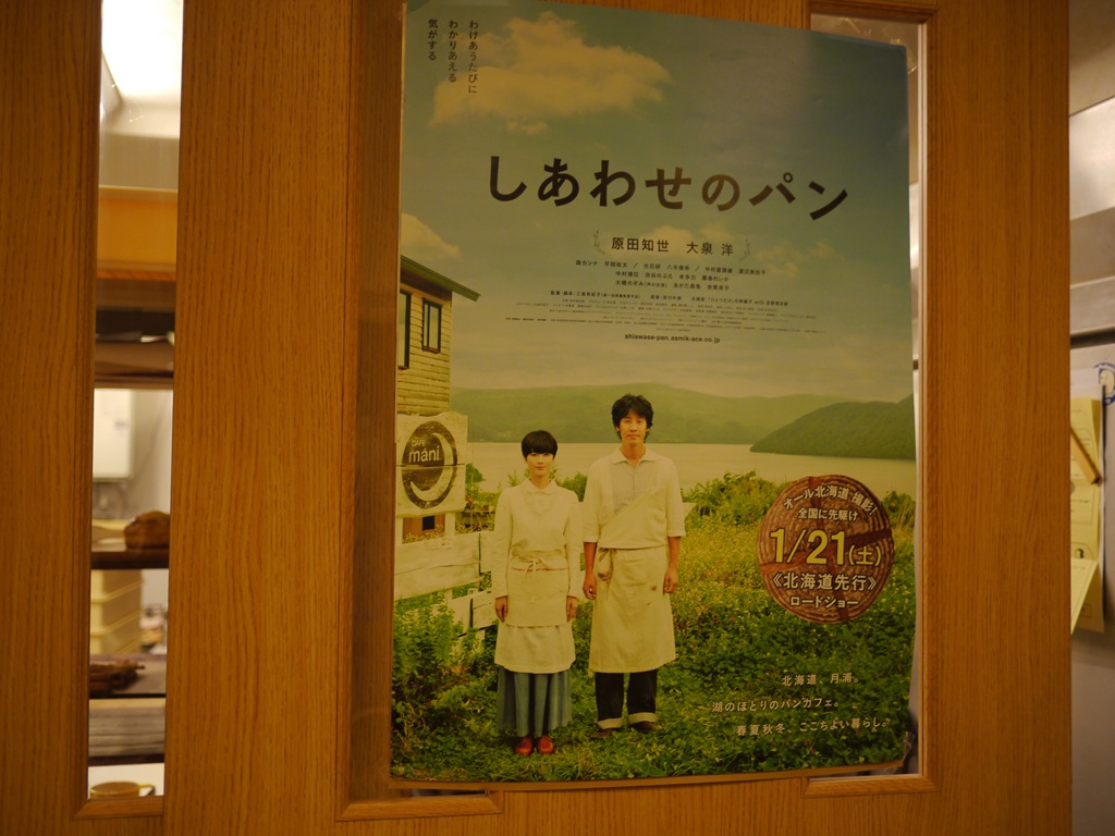 パオンのドアを見ると、北海道先行ロードショーのしあわせのパンのポスターが貼ってありました。みてみたい映画です。パオンの店内に雰囲気も良くあっています。