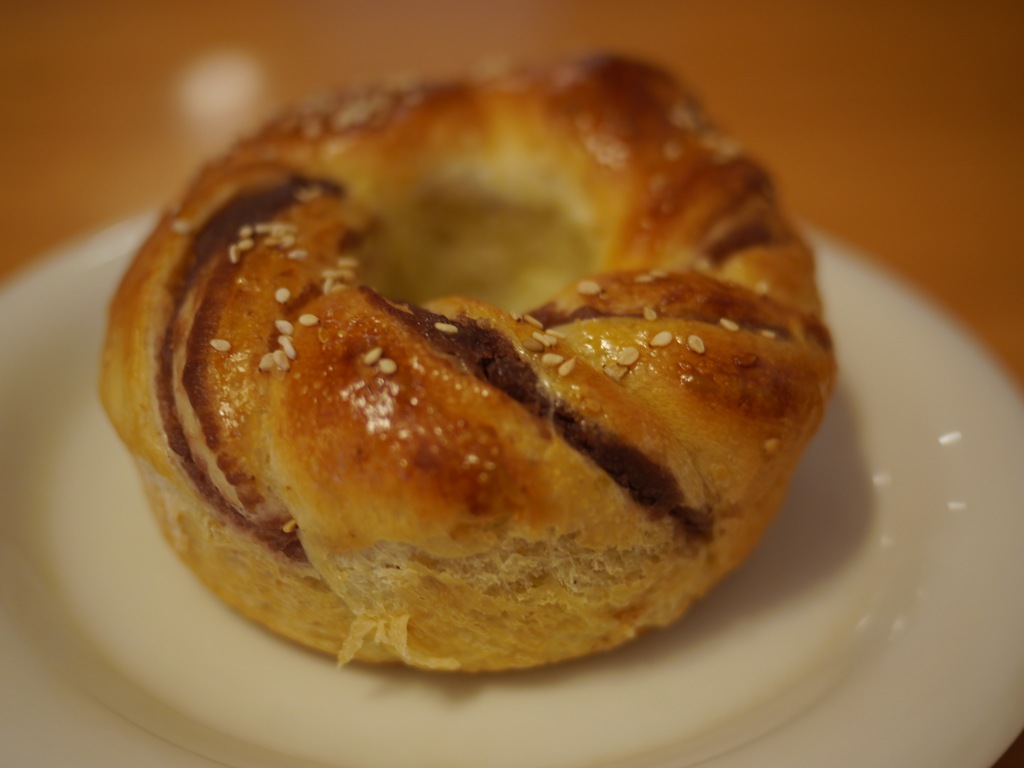 日曜の朝は、パンを食べることが多くて、土曜の夕方仕事帰りに裏参道のパオンに立ち寄りました。夕方を過ぎて結構売れてしまっていたのですが、4つほど選びました。ゴマリングチョコに見えたストライプは食べてみるとあんでした。