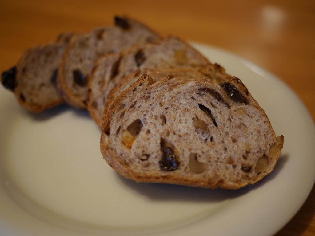フルーツライブレッド ハーフサイズ210円 ハーフサイズをさらに切り分けてもらいました。ライ麦の味と香り、フルーツたっぷりのおいしいパントースターで温めていただきました。