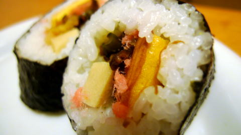 すし善蕾亭から持ち帰った太巻き、見た目に鮮やかな太巻きはお祝い気分を盛り上げてくれます。