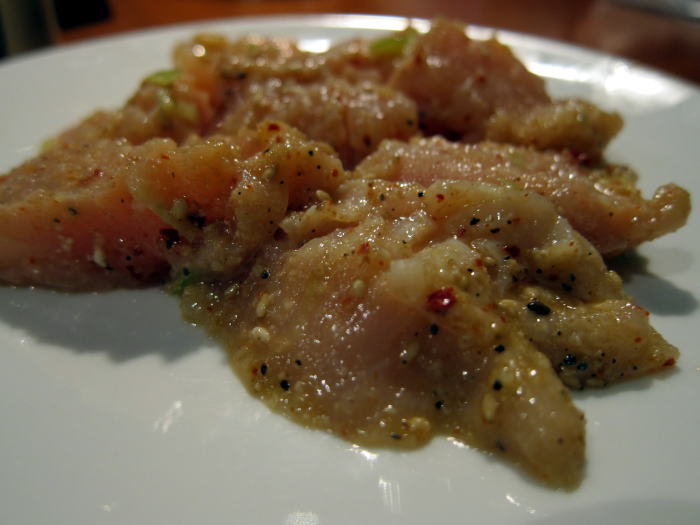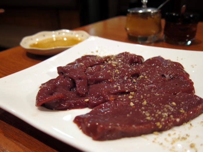 日曜の夜のためか、いろいろなメニューが品切れでしたが、レバ刺しは食べることができました。