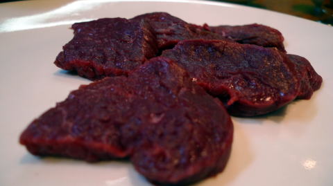 しっかり集中していないと焼きすぎてしまうので注意が必要です。阿寒で狩猟された野生の鹿、新鮮な肉は生臭みもなく、おいしいの一言です。