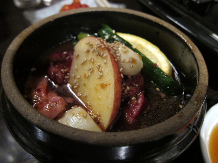 壺のなかには、分厚いカルビが2枚に野菜がごろごろと入っていて、見るからにおいしそうです。