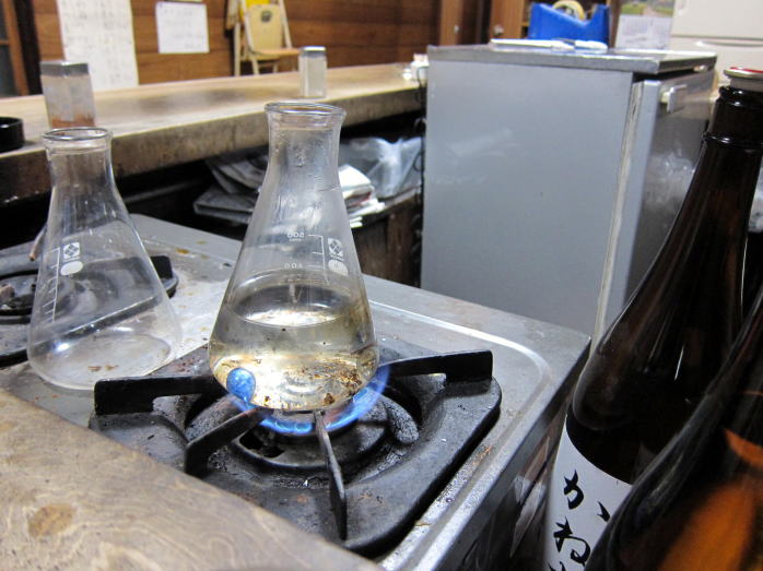 聞くと日本酒は昔からフラスコという話でした、理科の実験のようですが、飲んでみるとちょうど飲みやすくおいしくあつかんをいただきました。