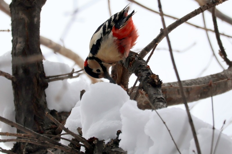 雪の琴似神社境内に響くアカゲラの木をつつく音
