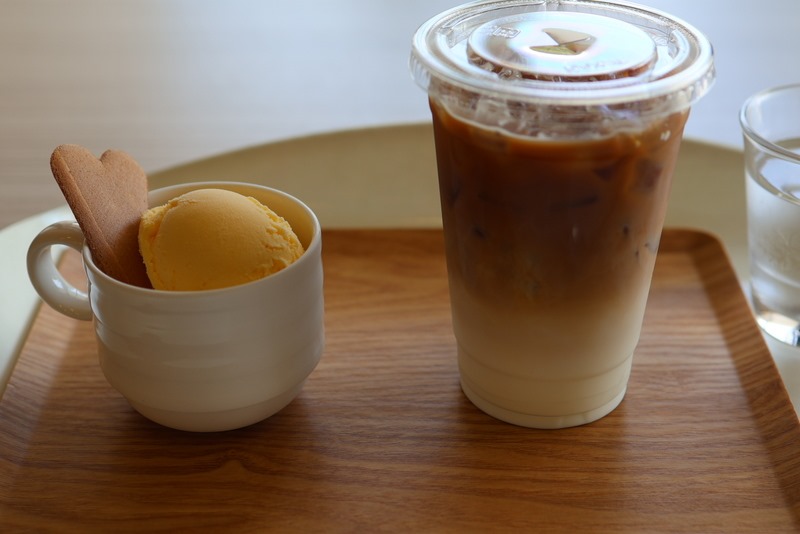 東京観光で國學院博物館のビル1Fにあるカフェラウンジ若木が丘で博物館鑑賞の後の休憩にアイスクリームとカフェラテおいしい!