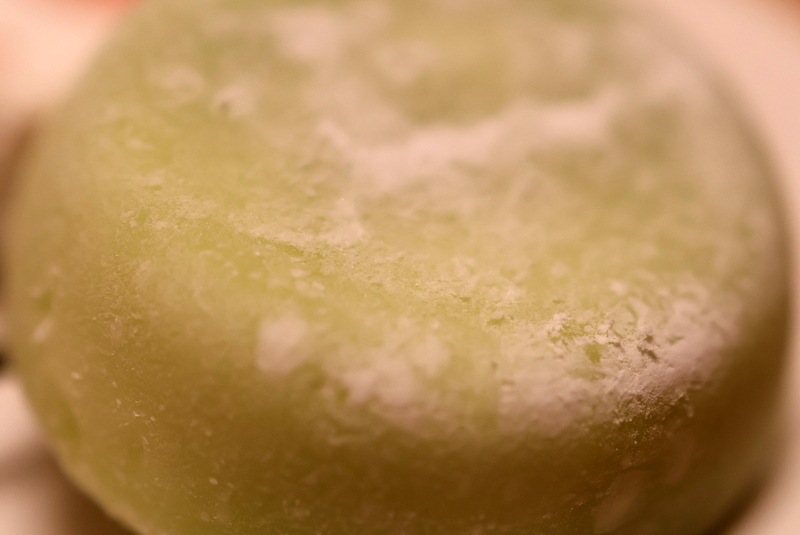 鶯色のお餅が美しくかむとマスカット果汁が飛び出してくるおいしい