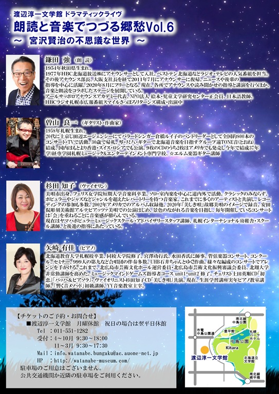 音楽は北海道を代表するアーチストの皆さん。ヴァイオリン杉田知子・ギター曽山良一・ピアノ矢崎有佳の3人です。一曲をのぞきすべてオリジナル曲で構成しています。毎年読んでいる名作「八郎」はネイティブ秋田弁で・・今年は音を厚くして、さらに心に残る演出をしました。